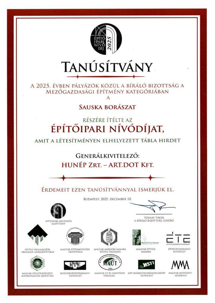 We are pleased to announce that HUNÉP Zrt. has won the 2025 Construction Industry Award in the “Agricultural Buildings” category for the construction of the Sauska Winery in Rátka. The prestigious award was presented to Mr. Miklós Bakos, CEO at the ÉVOSZ Annual General Meeting on December 10, 2025, one of the most significant professional recognitions in the Hungarian construction industry.