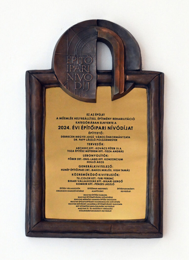 A Csokonai Színház rekonstrukciója újabb elismerést kapott: 2024-ben a projekt elnyerte az Építőipari Nívódíjat, amelynek emléktábláját ma ünnepélyes keretek között avatták fel a felújított színház épületében.